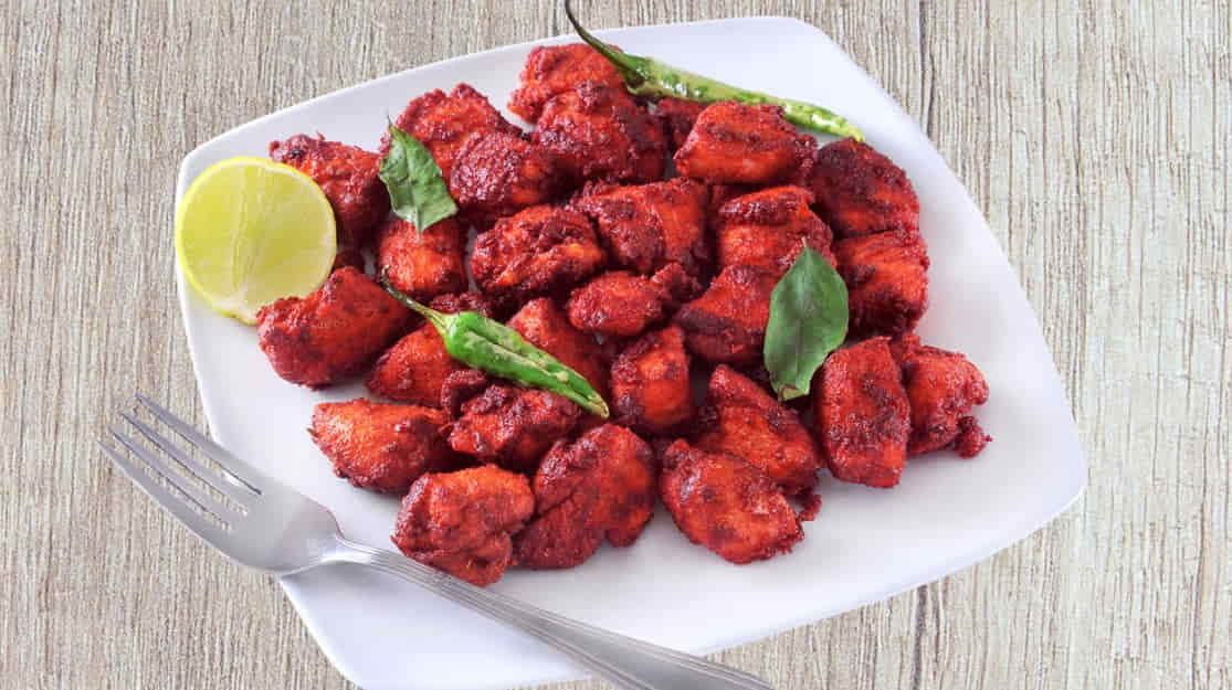 Diced chicken marinated with flour, spices and curry leaves & deep fried.