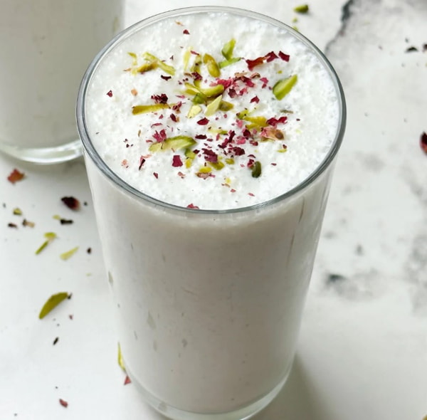 A sweet, creamy yogurt drink blended with sugar and served chilled for a refreshing treat.