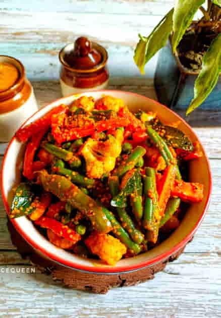 A tangy and spicy blend of assorted vegetables and fruits, preserved in flavorful spices and oil.