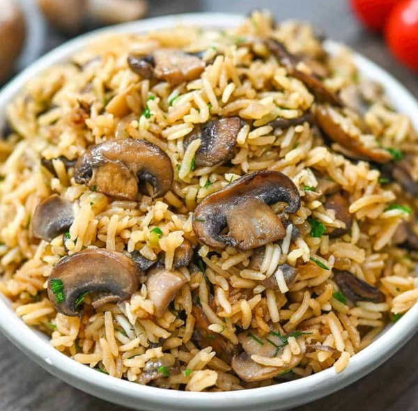 flavorful stir-fried rice with mushrooms, vegetables, and aromatic spices – a satisfying large portion.