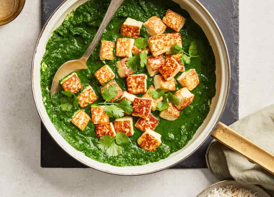Cubes of homemade cottage cheese cooked with spinach leaves.