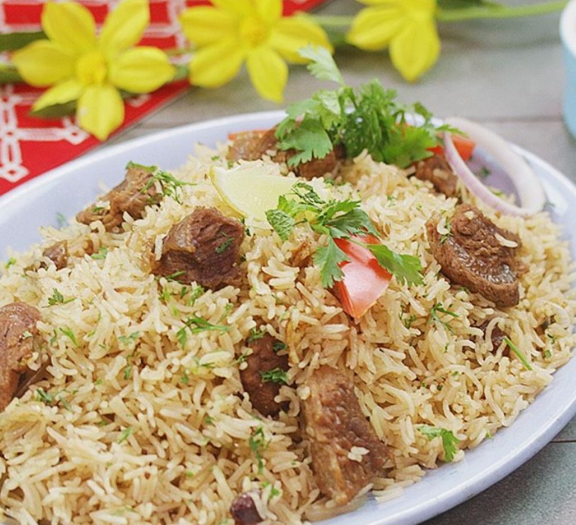 A generous portion of fragrant basmati rice, cooked with aromatic spices for a flavorful side.