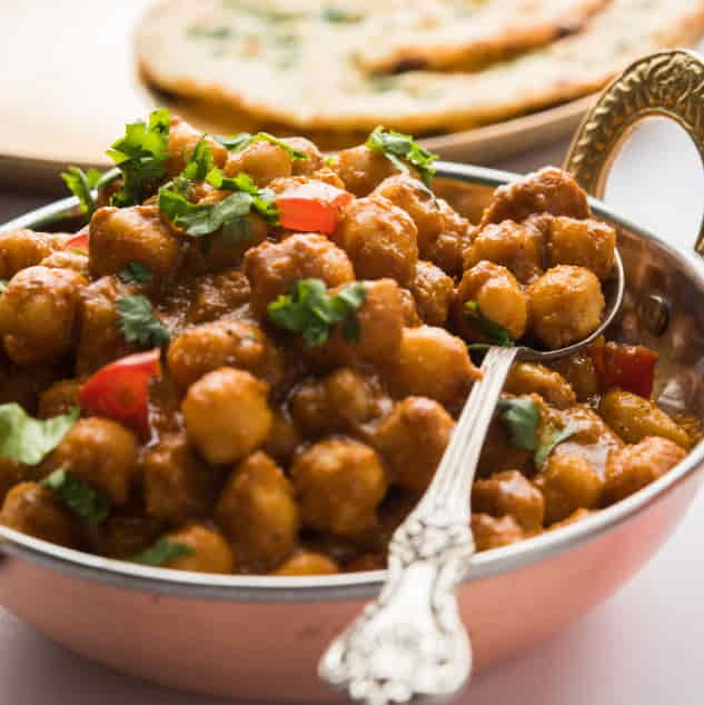 Chickpeas cooked with tomato, onions, green peppers and chana masala.