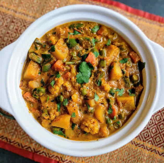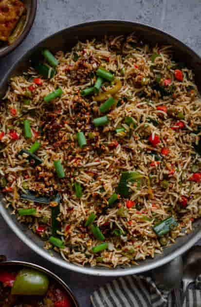 It comes with Seasonal Mixed Veg Curry, Tarka Daal, Brunt Garlic rice and Veg Pakora.